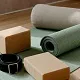 Essential yoga accessories: mat, pants, blocks, strap, bolster, towel, wheel.